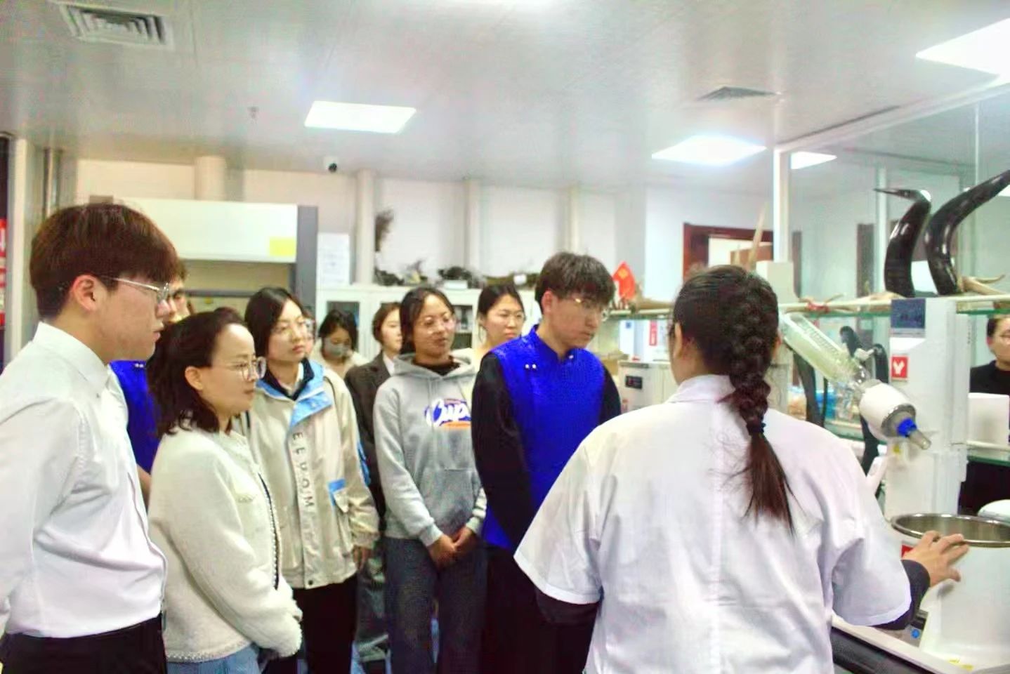 敖敦格日乐老师详细介绍实验室的主要研究方向和内容,专注于化学药理研究,配备多种贵重仪器,其中高效液相仪器是核心部分。介绍了进口的旋转蒸发仪器,讲解提取分离单体的过程。