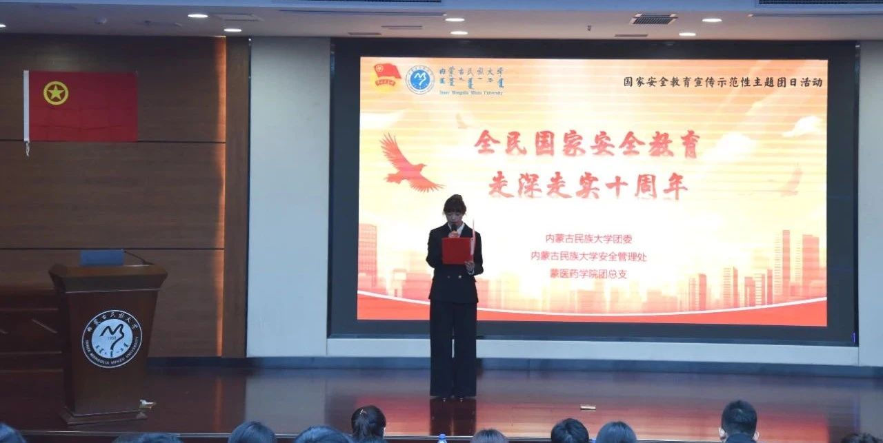 为深入贯彻落实习近平总书记关于国家安全观的重要指示精神,增强全民国家安全意识,筑牢国家安全人民防线,4月15日,内蒙古民族大学“全民国家安全教育 走深走实十周年”示范性主题团日活动在图书馆小报告厅成功举办。校团委副书记王强、蒙医药学院党委副书记呼和、校团委组织部部长敖敏、团总支书记水莲、科研助理雪莲及各学院学生参加。