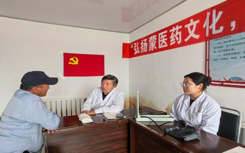蒙医药学院副院长、博士生导师、自治区名蒙医宝龙教授为村民们把脉诊断病情,给予健康指导。团队成员为村民测量血压,记录病情数据。大学生志愿者化身“科普宣讲员”,通过实物展示和生动讲解,向村民科普蒙药材知识,介绍其功效与应用。为村民发放健康宣传单,提升群众健康防护意识。