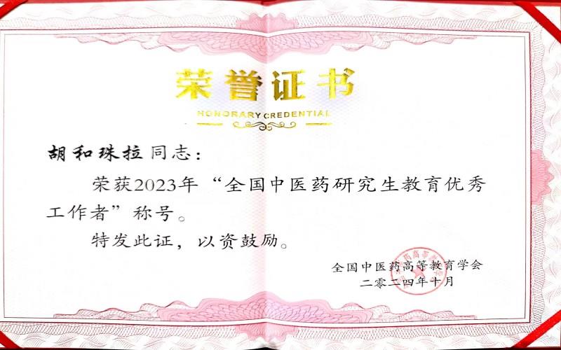 我院学科办主任胡和珠拉荣获2023年度全国中医药研究生教育优秀工作者称号。这一荣誉的取得既是对胡和珠拉同志在研究生教育工作方面无私奉献、个人管理能力的充分肯定,也是中药学(蒙药学)学科点在研究生教育教学、科学研究、管理服务等方面取得成绩的高度认可。