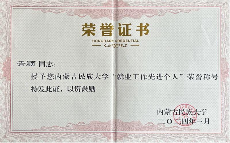 这一荣誉的获得,不仅是对其个人工作的肯定,也是对学院就业创业工作的认可。对于青顺本人来说,既是荣誉也是责任。他表示,今后将继续努力工作,为学生的就业创业工作贡献更多的力量。