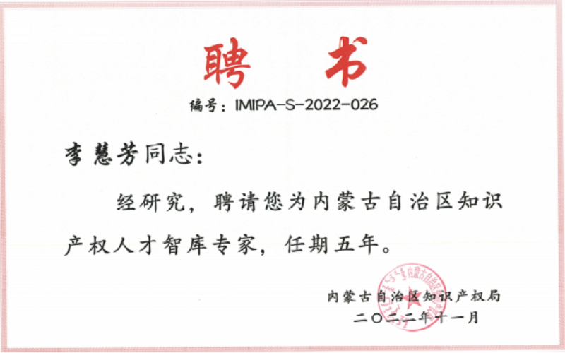 内蒙古自治区第二批知识产权人才智库专家聘书