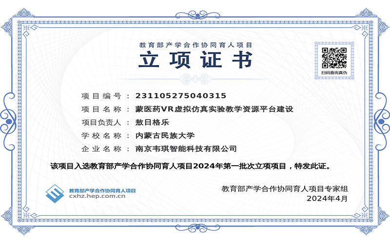 4月17日,教育部高教司下发《教育部高等教育司关于公布2024年第一批产学合作协同育人项目立项名单的通知》,我院教师敖日格乐申报的项目《蒙医药VR虚拟仿真实验教学资源平台建设》获准立项。