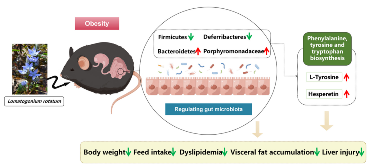 肋柱花(LR)是一种民间草药,传统上用作降脂和抗肥胖剂,但其药理机制尚不清楚。该研究通过整合肠道微生物群和代谢组学分析,评估了LR对肥胖小鼠肠道微生物和血清代谢物的改变,以及对内脏脂肪和血脂调节的相关机制。