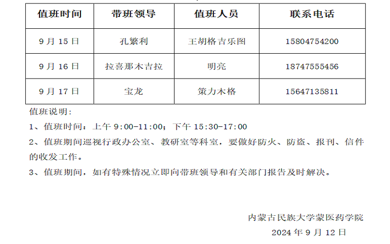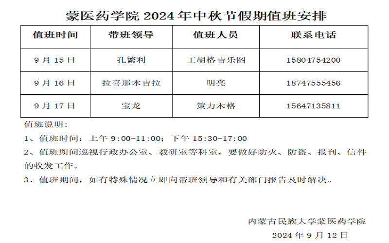 蒙医药学院2024年中秋节假期值班安排