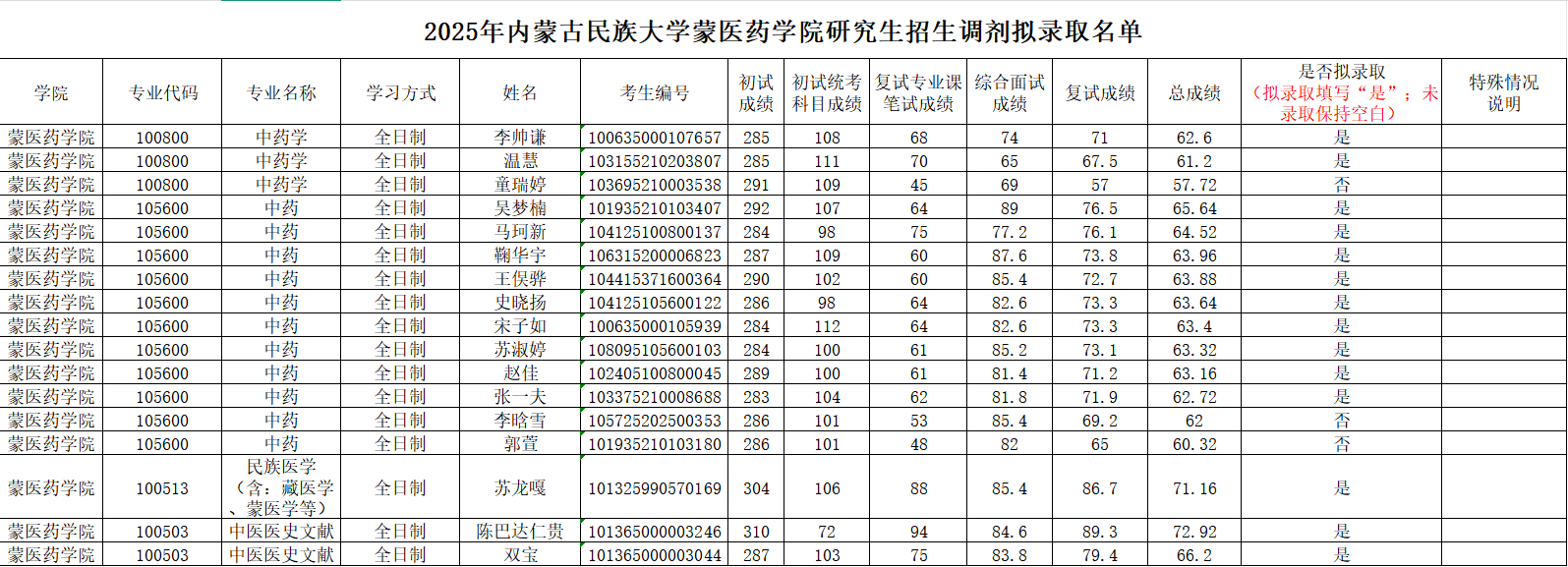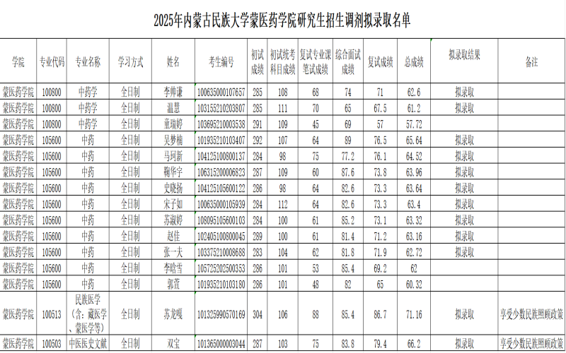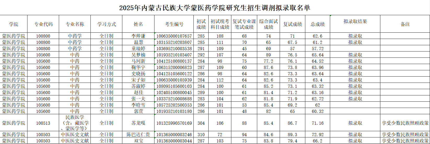 2025年内蒙古民族大学蒙医药学院研究生招生调剂拟录取名单