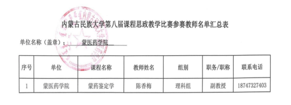 一、根据教师发展中心《关于开展内蒙古民族大学第八届课程思政教学比赛的通知》的要求,学院组织开展院级初赛。经评选,推荐陈香梅老师参加学校比赛,现予以公示如下。